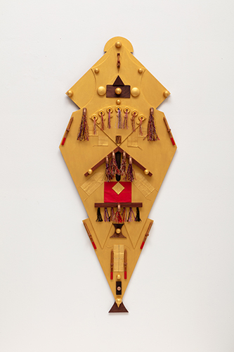 slender regal kite (detail), 2019, 43 x 18 ¼ x 2 ½ , mdf board, birch, maple, mahogany, cherry, padauk, purpleheart, wenge, zebrawood, copper, steel, felt, japanese fiber, metallic floss, acrylic paint
